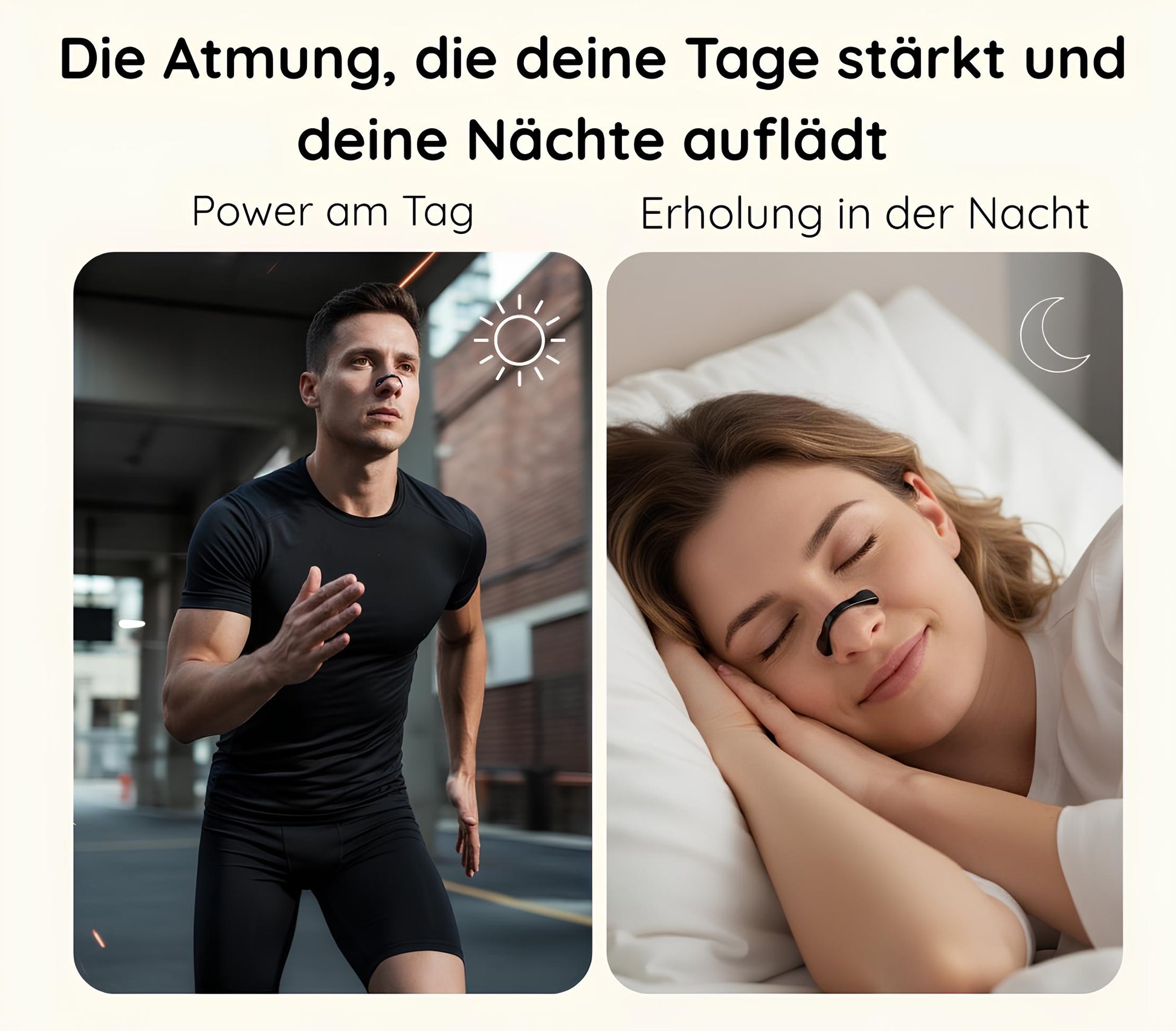 Dank eines innovativen Magnetsystems werden die Nasenflügel sanft geöffnet, um die Atemwege zu befreien – ideal für besseren Schlaf, leichteres Atmen und mehr Leistungsfähigkeit.